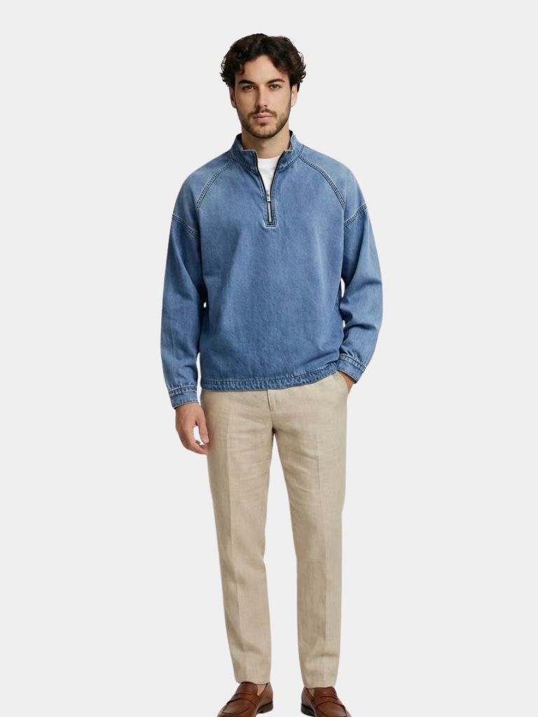 Elevate your casual wardrobe with this refined stonewash denim quarter zip. The vintage-inspired wash creates distinctive character while the quarter-zip silhouette offers versatile layering options for any season. Crafted from durable denim, this piece seamlessly transitions from weekend wear to smart-casual settings. The timeless aesthetic pairs effortlessly with both classic and contemporary pieces, making it an essential addition to your collection.